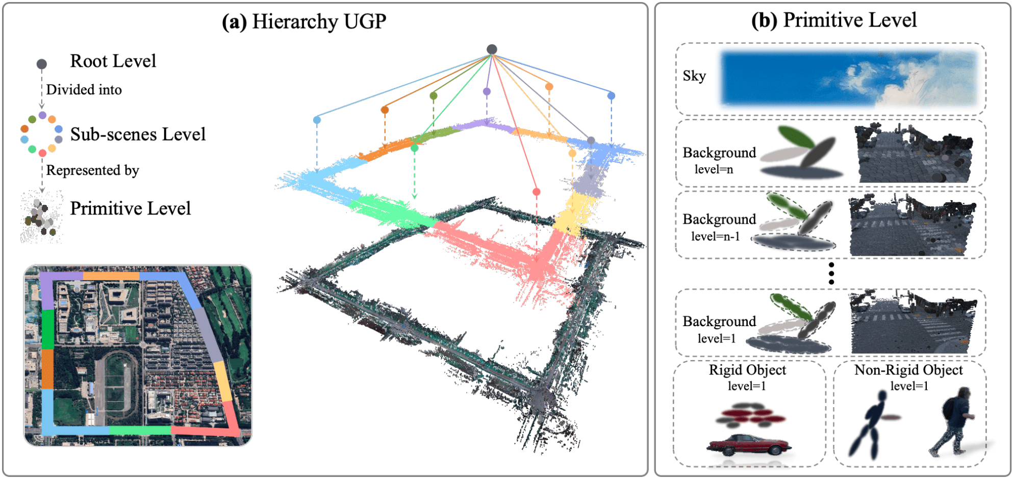 Combining hierarchy and unified Gaussian primitives to efficiently reconstruct large-scale dynamic street scenes.